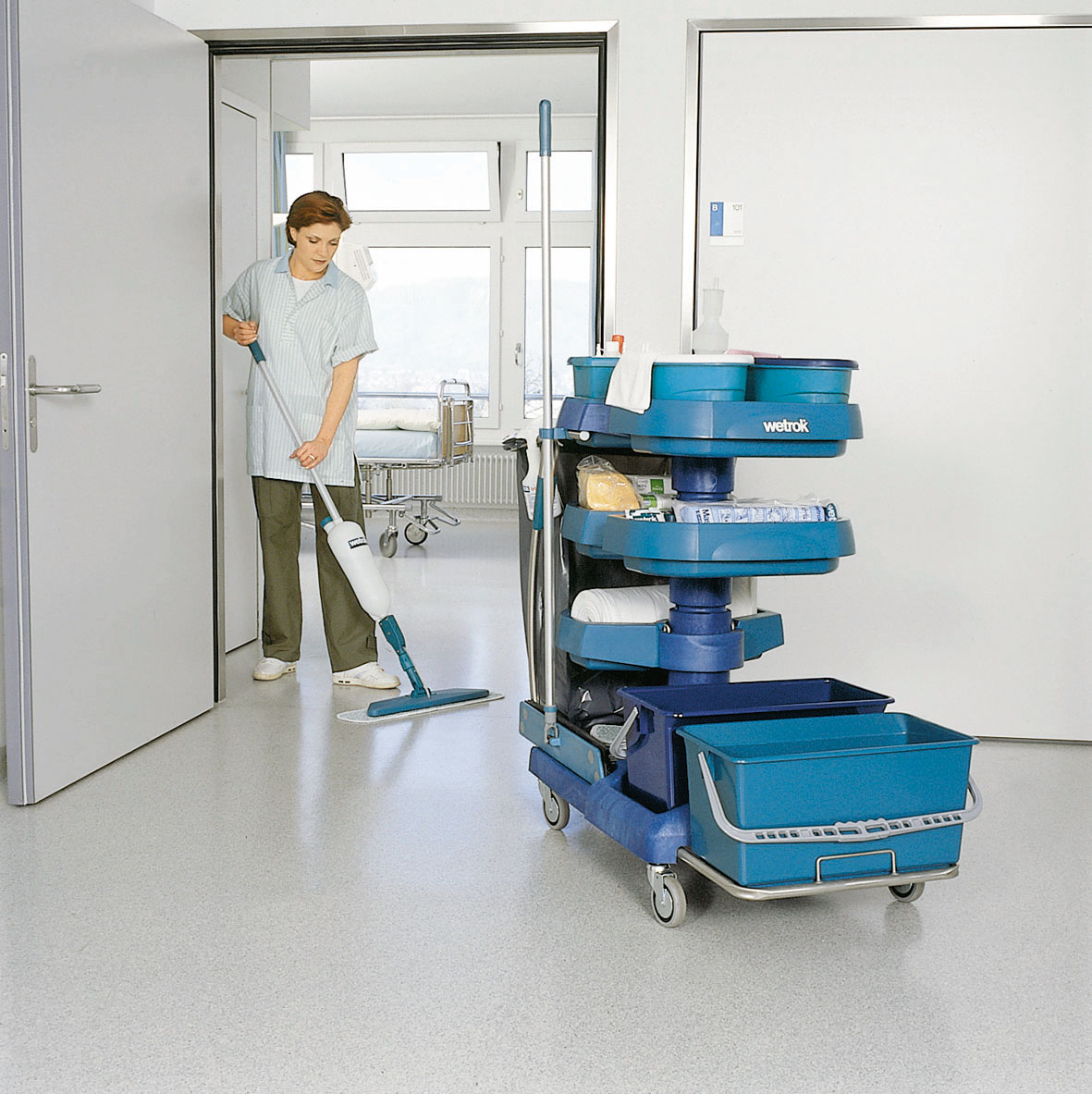 Уборочные тележки Wetrok Smartcar выполнены из ударопрочного термостойкого пластика, стойки из алюминия, колеса с подшипниками из нержавеющей стали и полиуретановыми ободами. Тележки можно подвергать термической обработке с целью дезинфекции